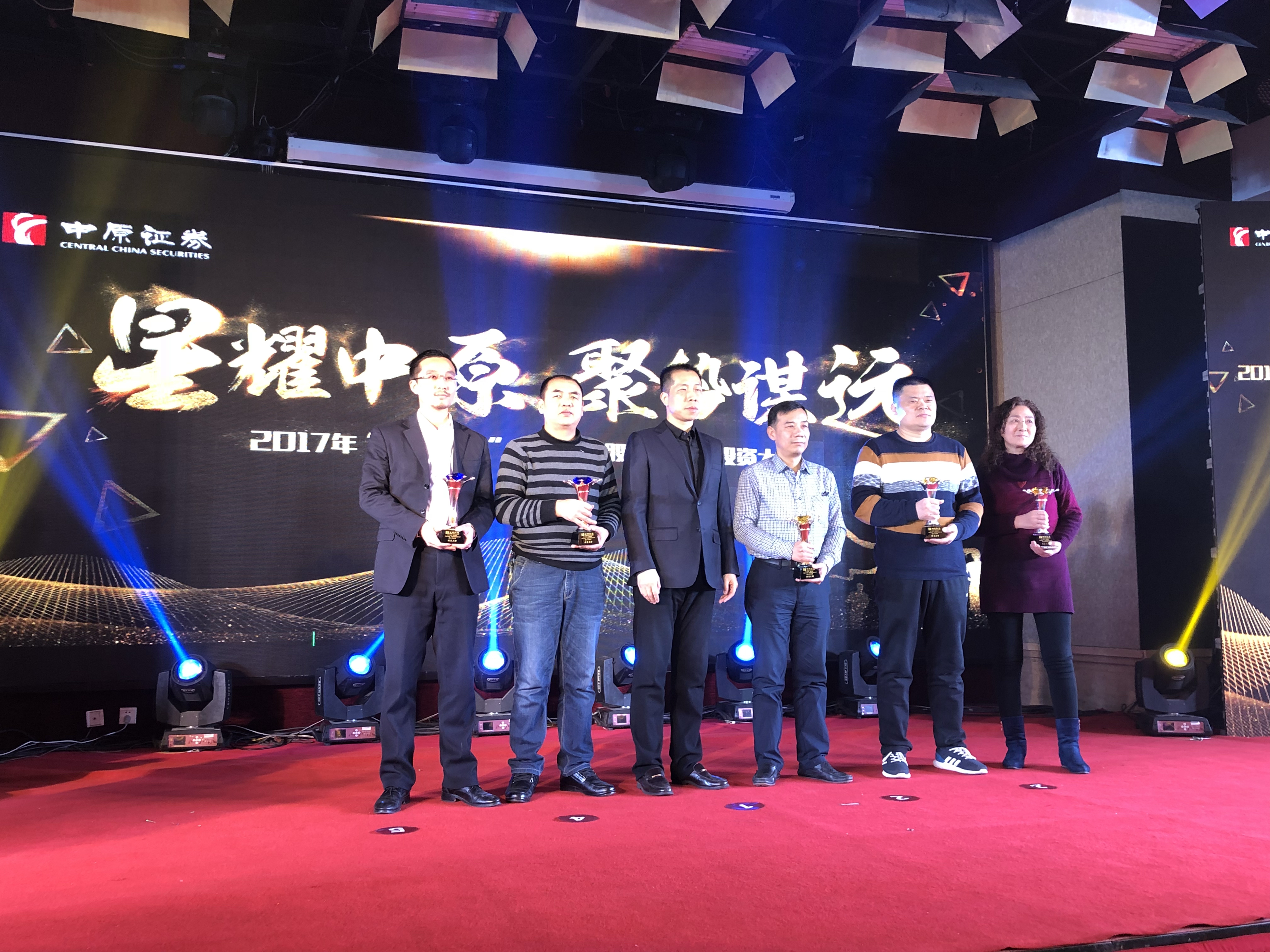 大河网讯 2018年1月27日,中原证券在郑州举办2017年度(第四届)"赢在中原"实盘理财竞技大赛暨"中原投顾精英赛"颁奖盛典,总裁助理周江华,经纪业务条线各部门和创新业务总部总经理出席本次颁奖活动,活动还特邀中国联通河南分公司副总经理赵海燕,大宋官窑销售总监蔡创业共同为获奖选手颁奖,以及来自中原证券省内外超过30家营业部的300多名投资者参加本次颁奖活动。