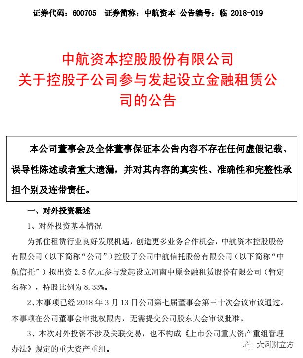 根据其公告内容显示,为抓住租赁行业良好发展机遇,创造更多业务合作机会,中航资本控股子公司中航信托股份有限公司(以下简称“中航信托”)拟出资2.5亿元参与发起设立中原金租(暂定名称),持股比例为8.33%。