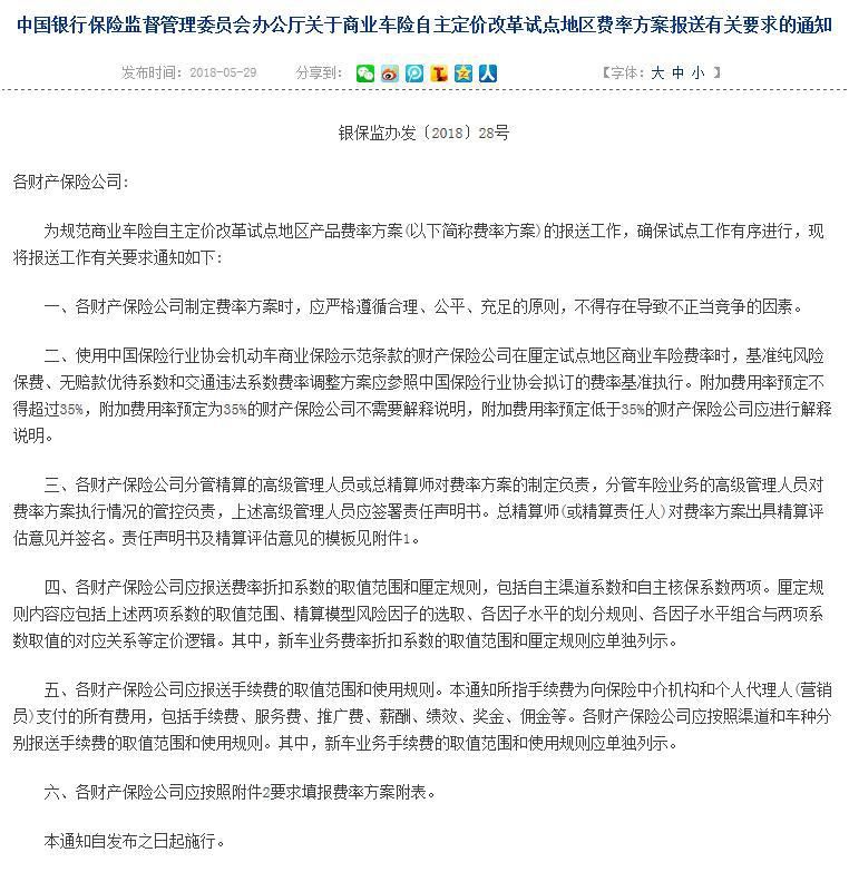 中国网财经5月29日讯 今日,中国银行保险监督管理委员会发布一则《中国银行保险监督管理委员会办公厅关于商业车险自主定价改革试点地区费率方案报送有关要求的通知》(以下简称《通知》)。