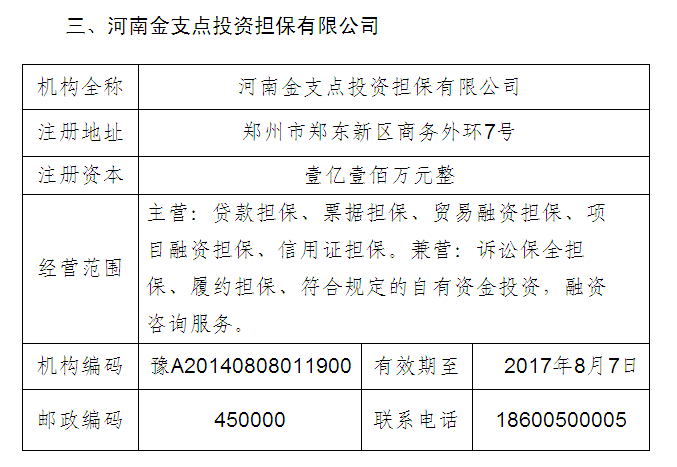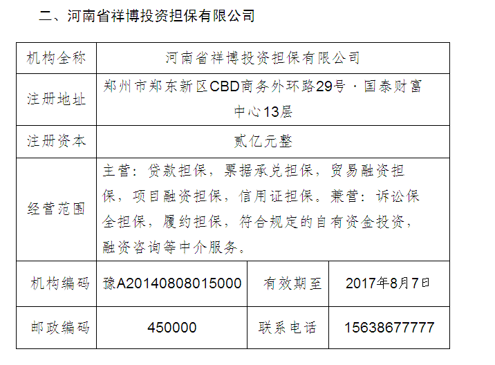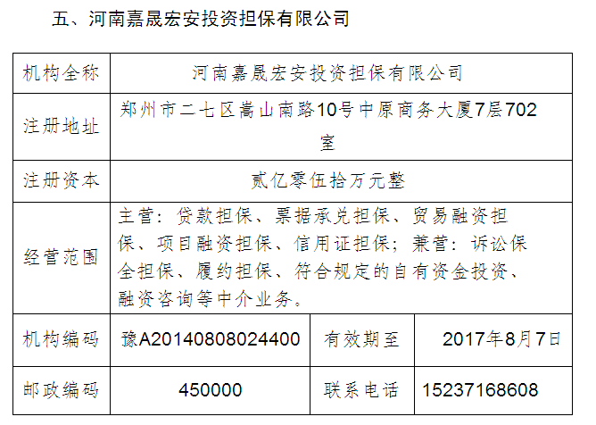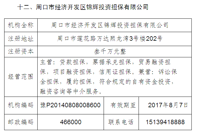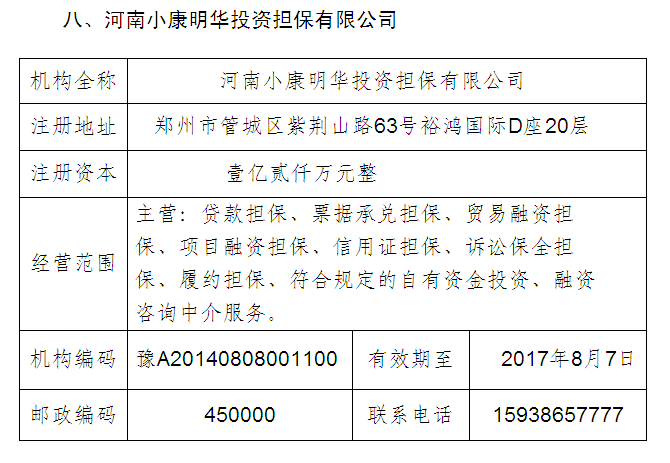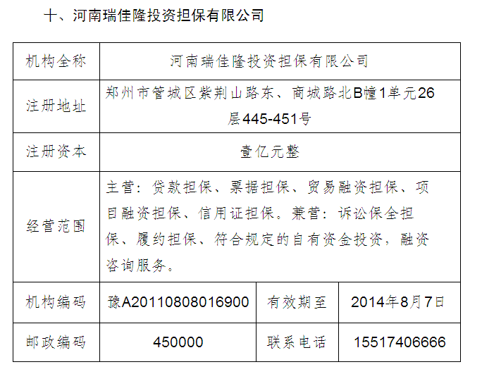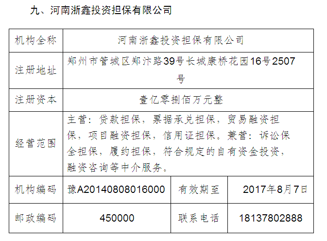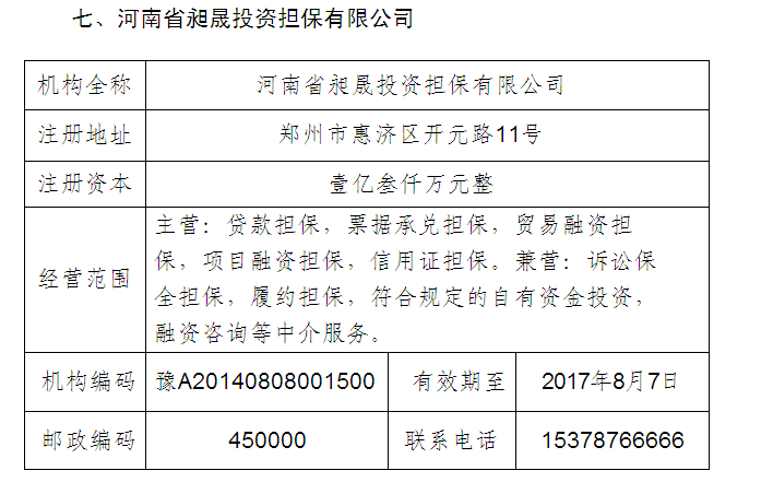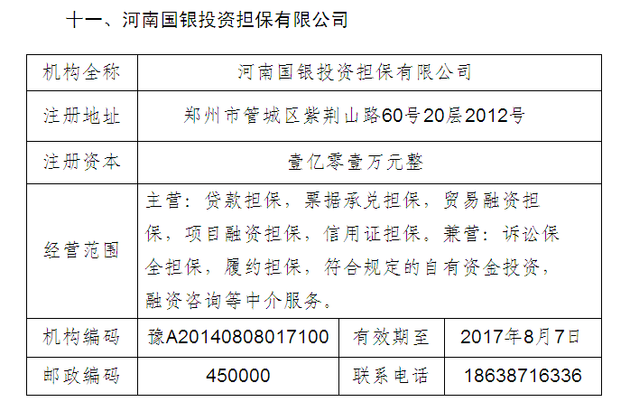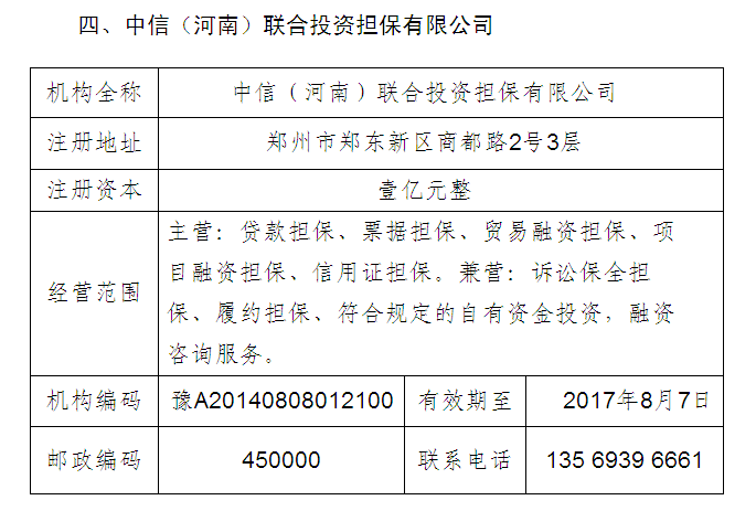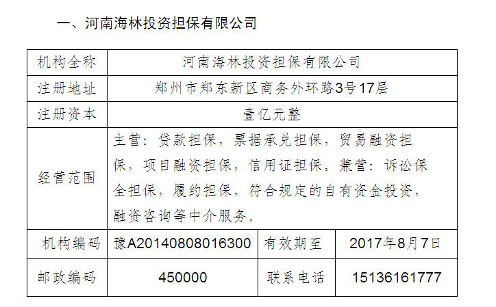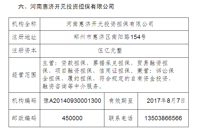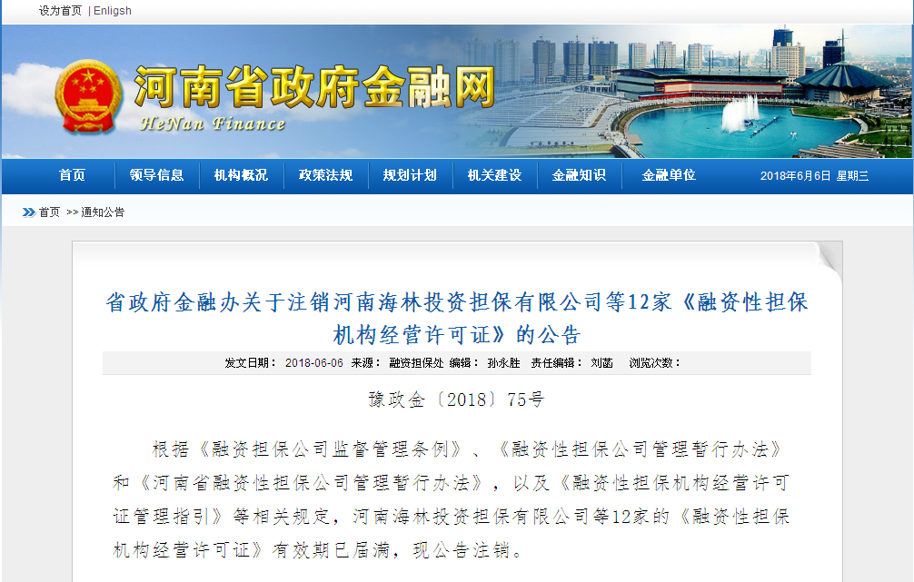 大河网讯(记者 申久燕)6月6日,大河网记者从河南省政府金融网获悉,河南海林投资担保有限公司、河南惠济开元投资担保有限公司、中信(河南)联合投资担保有限公司等12家的《融资性担保机构经营许可证》被注销。