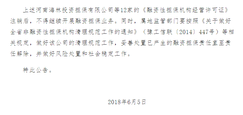 此外,上述河南海林投资担保有限公司等12家的《融资性担保机构经营许可证》被注销后,不得继续开展融资担保业务。同时,属地监管部门要按照《关于做好全省非融资性担保机构清理规范工作的通知》(豫工信联〔2014〕447号)等相关规定,做好该公司的清理规范工作,妥善处置已产生的融资担保责任直至责任解除,并做好风险处置和社会稳定工作。
