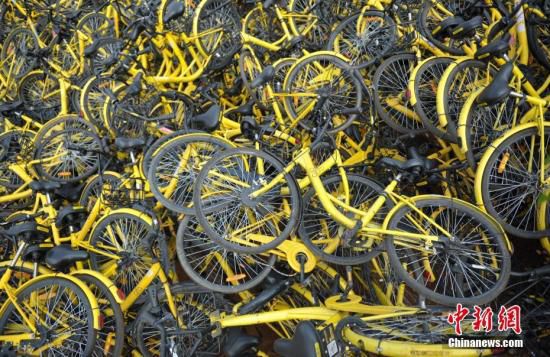 资料图:成都一停车场内堆放了不少共享单车,大多数车锁已被拆除,这些单车系临时回收、维修中转车辆。中新社记者 刘忠俊摄