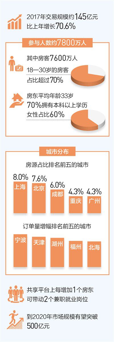 近年来,我国共享住宿市场迎来爆发式增长。共享住宿以互联网平台为依托,整合海量分散的住宿资源,它可以是一间房,也可以是一套房,可以是城市里的公寓,也可以是乡村小院。国家信息中心分享经济研究中心发布的《中国共享住宿发展报告2018》显示:2017年我国主要共享住宿平台的国内房源数量约300万套;参与者人数约为7800万人,其中房客约7600万人;共享住宿市场交易规模约145亿元,比上年增长70.6%。