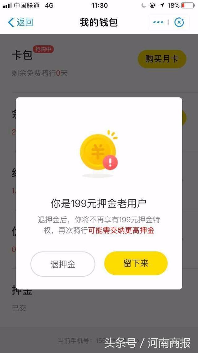 6月28日,多位郑州ofo单车用户反馈,在申请退押金页面,ofo单车页面给出了这样的提示:“退押金后,你将不再享有199元押金特权,再次骑行可能需要交纳更高押金。”其中“可能需要交纳更高押金”一句还用红色字体显示,区别于另外语句。