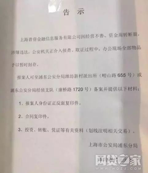 警方发布告示称上海普资金服因经营不善,资金链断裂,涉嫌违法,XX机关正在介入侦查、取证过程中,办公室现场全部物品予以封存。
