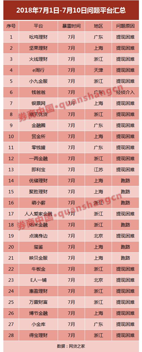 据网贷之家问题平台数据披露,截至7月10日,短短10天内,全国共出现28家问题平台,1家经侦介入、6家跑步,其余21家均显示提现困难。记者注意到,7月暴雷平台主要分布在上海、浙江、广东三地。