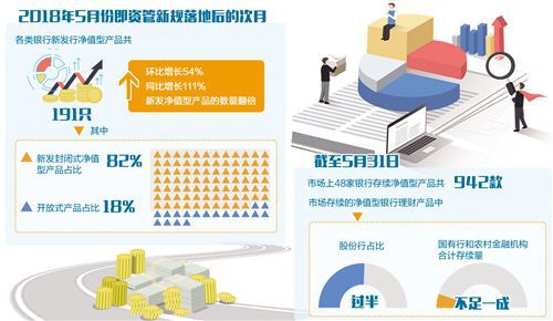 记者在采访中了解到,资管新规落地后,净值型银行理财产品的发行量较过去有明显提升,但总体来说数量仍然较少。普益标准数据显示,2018年5月份即资管新规落地后的次月,各类银行新发行净值型产品共191只,环比增长54%,同比增长111%,新发净值型产品的数量翻倍。其中,新发封闭式净值型产品占比82%,开放式产品占比18%;超九成新发净值型产品投向包含债券类资产和货币市场工具,保持了银行理财一贯的稳健风格。