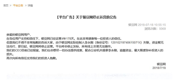 就在5个小时前,运营4年有余的银豆网公告称,实际控制人李永刚失联,资金暂无法兑付,已由CEO向公安机关报案。