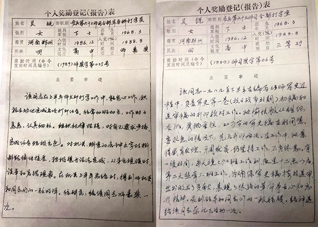 “那时候还没有电脑,打字不像现在这样简单,铅字的打印和印刷是个体力活。”吴锐回想到:“铅字太小,工作的时候特别费眼睛,工作时间长了眼睛慢慢的就近视了,甚至近视的度数在一天天的增加都没感觉到。而且在推墨印刷的时候,经常使用的右手每天要用力推刷无数次,时间长了自己都觉得右胳膊要比左胳膊粗上一圈。”但是也正是这样一丝不苟、不怕吃苦的工作态度,让她感受到了奉献和劳动的快乐。由于工作认真负责,也让吴锐荣获部队三等功和所在师的嘉奖。