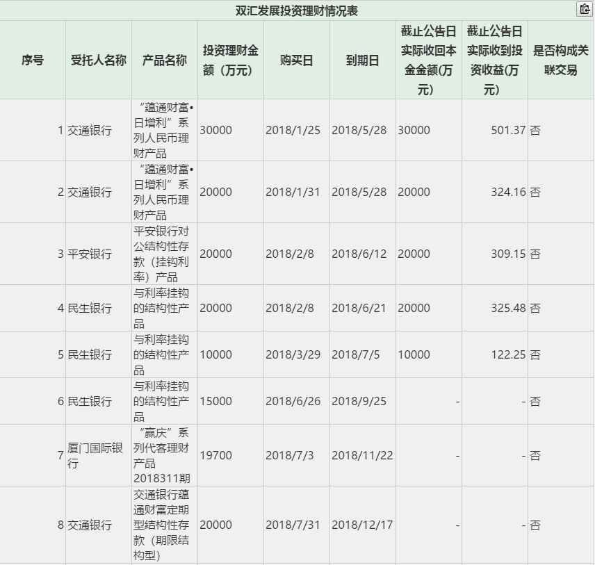 8月13日,河南双汇投资发展股份有限公司(简称双汇发展)发布公告称,双汇发展及控股子公司于本公告日前十二个月购买了交通银行、平安银行、民生银行、厦门国际银行、浙商银行、兴业银行、郑州银行的保本型理财产品和结构性存款24.47万元,截止本公告日尚未收回金额14.47万元。
