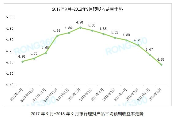 银行理财收益率持续“遇冷”。 据融360发布的《2018年9月银行理财市场分析报告》显示 ,9月,银行理财产品平均预期收益率为4.58%,比8月下降0.09个百分点,为一年以来的最低值。这已是理财产品收益率连续7个月下跌。