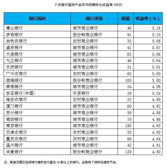 数据显示,仅9家银行理财产品平均收益率在5%以上。融360对9月份发行量在30款以上的银行所发行的理财产品平均预期收益率进行排名(由于结构性理财产品实际收益率达标情况较低,故将结构性理财剔除,本排名只包括非结构性理财),入榜银行中唐山银行平均预期收益率最高,达5.16%,其次为浙商银行,收益率为5.10%。