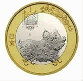 面额10元的双色铜合金纪念币正面图案为“中国人民银行”、“10元”字样、汉语拼音字母“SHIYUAN”及年号“2019”,底纹衬以团花图案。背面主景图案为一只中国传统剪纸艺术与装饰年画元素相结合造型的小猪,其上方为宫灯和石榴花图案,币面左侧刊“己亥”字样。