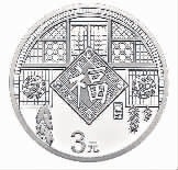 2019年贺岁纪念币一套共2枚,面额3元的银质纪念币正面图案为中华人民共和国国徽,并刊国名、年号。背面图案为“福”字造型,配以窑洞、窗棂、玉米、辣椒等造型组合设计,并刊面额。