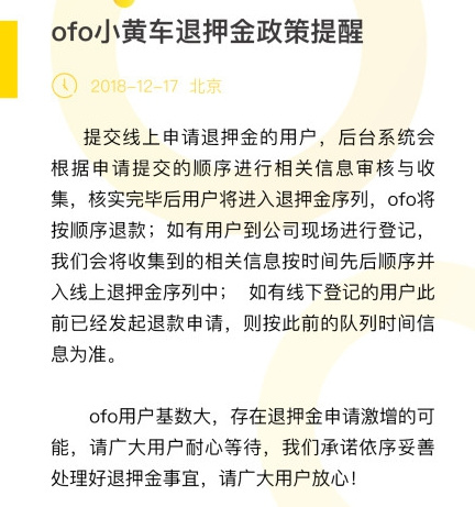 17日晚,ofo官方紧急发布“ofo小黄车退押金政策提醒”,称提交线上申请退押金的用户,后台系统会根据申请提交的顺序进行相关信息审核与收集,核实完毕后用户将进入退押金序列,ofo将按顺序退款。