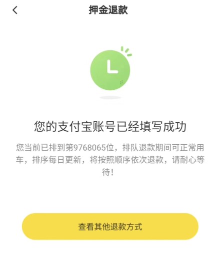 眼看退款人数不断增加,许多用户都表示对退款不抱希望。“我从去年年初开始用ofo,充了200元,现在余额还有十几元。最近路上见不到ofo了,之前听家人说打电话就能退押金,我没试,18日才想起来退,已经排到700多万名了。今天(19日)再看排名,几乎没怎么变化。”北京市民小施告诉中新经纬客户端,她认为照这个趋势,自己的押金大概率拿不回来了。