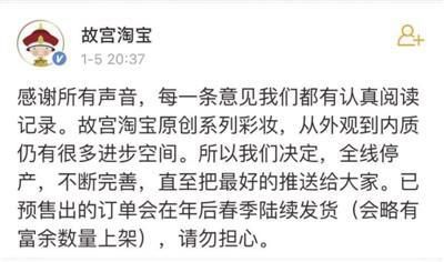 记者注意到,1月5日,故宫淘宝在官方微博上表示,为不断完善,其原创系列彩妆决定全线停产,已预售的订单则会在年后春季陆续发货。