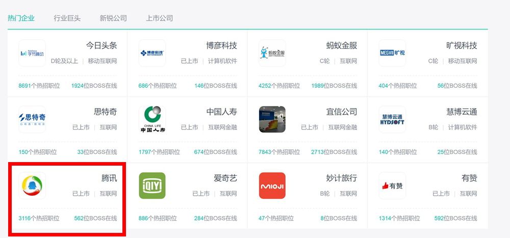 热门企业有大量BOSS在线招聘。图片来源:BOSS直聘网站