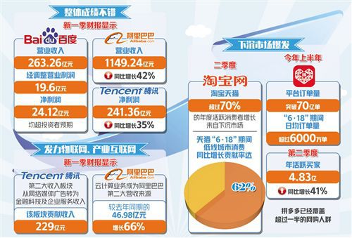 从新一季财报看,互联网巨头们成绩不错。百度新财季营收达263.26亿元,经调整营业利润19.6亿元,净利润24.12亿元,均超投资者预期;阿里巴巴这一季度收入达1149.24亿元,同比增长42%;腾讯净利润241.36亿元,同比增长高达35%。