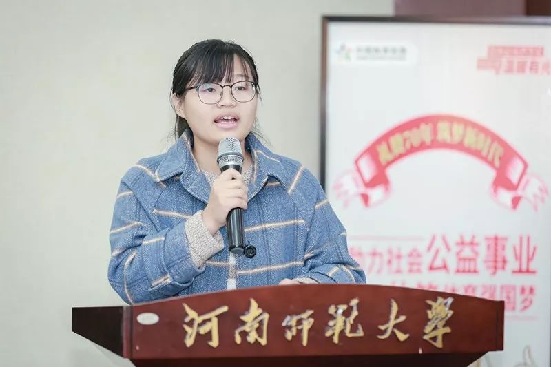 在捐赠仪式上,来自文学院19级汉语国际教育专业张薇代表受助学生发言,感谢“中国体育彩票·新长城助学基金” 让她离梦想又迈近了一步。她代表自己和所有的受赠学生向与会人员表示,滴水之恩,应当涌泉相报。他们接受来自国家和社会的帮助,也怀有一颗感恩之心,走上社会后,他们也将奉献自己的爱心,回报社会。