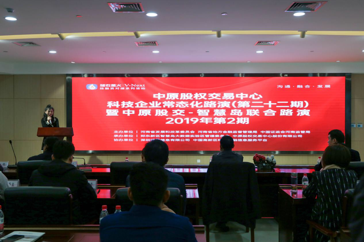 大河网讯 12月26日下午,中原股权交易中心科技企业常态化路演(第22期)暨智慧岛联合专场(2019年第2期)路演活动在郑东新区智慧岛综合实验区成功举行。本次活动由省发改委、省金融局和证监会河南监管局主办,郑东新区智慧岛大数据实验区管理委员会和中原股权交易中心承办,深圳证券信息有限公司、中国高新区科技金融信息服务平台协办。