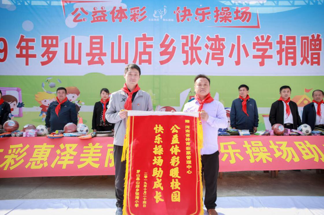 (2019年10月,河南省体育彩票管理中心书记韩宇(左)向信阳市罗山县山店乡张湾小学捐赠“公益体彩 快乐操场”)