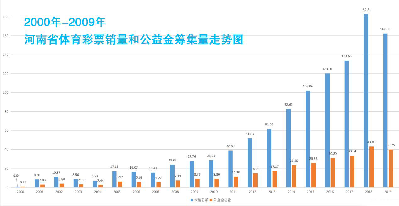(2000-2020年河南省体育彩票销量和公益金筹集量走势图)