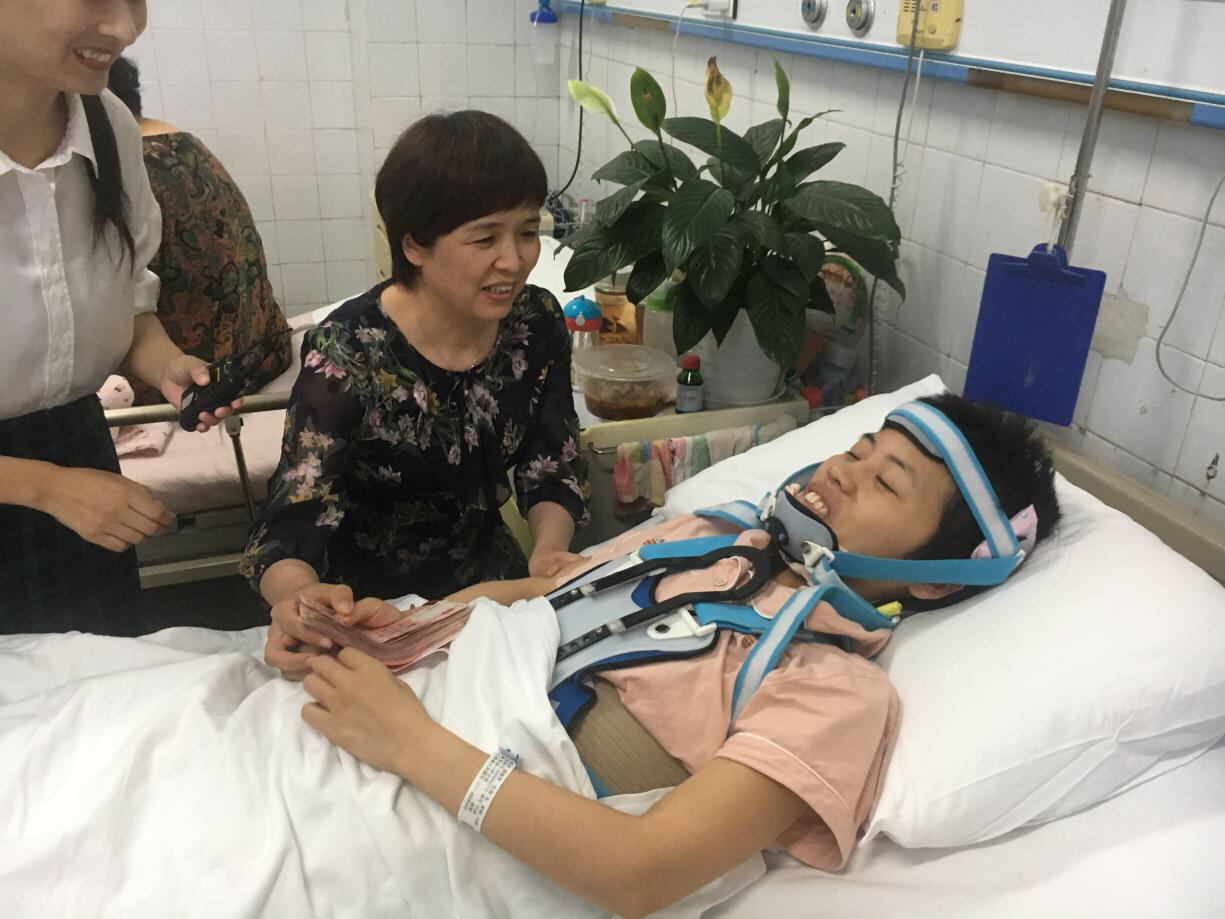 (2019年6月,时任河南省体育彩票管理中心书记王海新将“体彩助莉”捐助款送到受捐助者程艳芳手中)