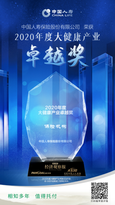 近日,“2020年大健康产业高峰论坛”在北京开幕。会上公布了2020年中国大健康产业奖项评选结果,中国人寿保险股份有限公司(以下简称“中国人寿”)荣获“2020年度大健康产业卓越奖”。
