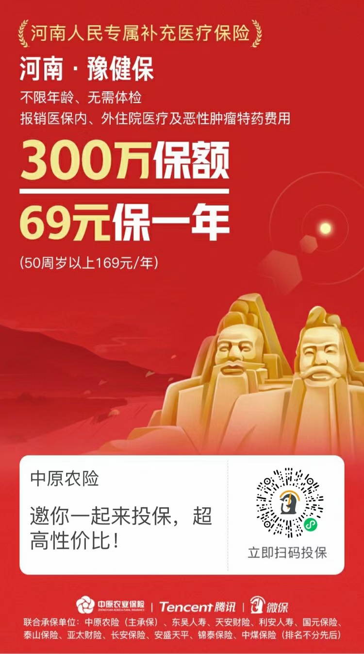 作为河南专属的省级普惠型补充医疗保险,“河南豫健保”有河南省相关部门监督,腾讯微保为合作平台,由中原农业保险股份有限公司主承保、联合多家保险公司共同打造,产品设计立足于当地公开医疗大数据,贴合河南人民实际需要,紧密衔接河南医保,减轻大病患者的医疗负担。