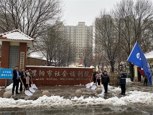 因心系着社会福利院的老人孩子们的出行,太平财险濮阳分公司志愿者队伍清晨就来到赶到福利院,他们带着雪铲、扫帚热火朝天地行动起来。寒冷的天气和凛冽的寒风抵挡不住志愿者的扫雪热情,欢笑声、铲雪声交至在一起,成为回响在城市里的乐曲。
