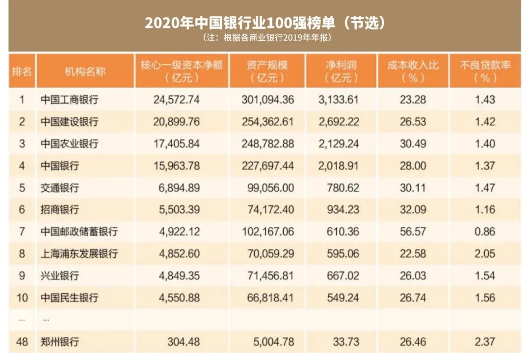日前,中国银行业协会发布“2020年中国银行业100强榜单”,郑州银行榜上有名,位列第48位。