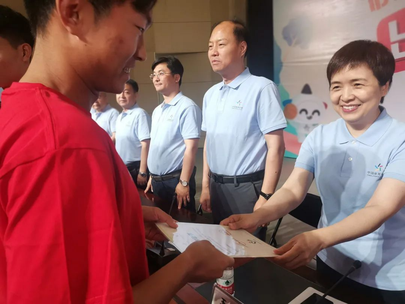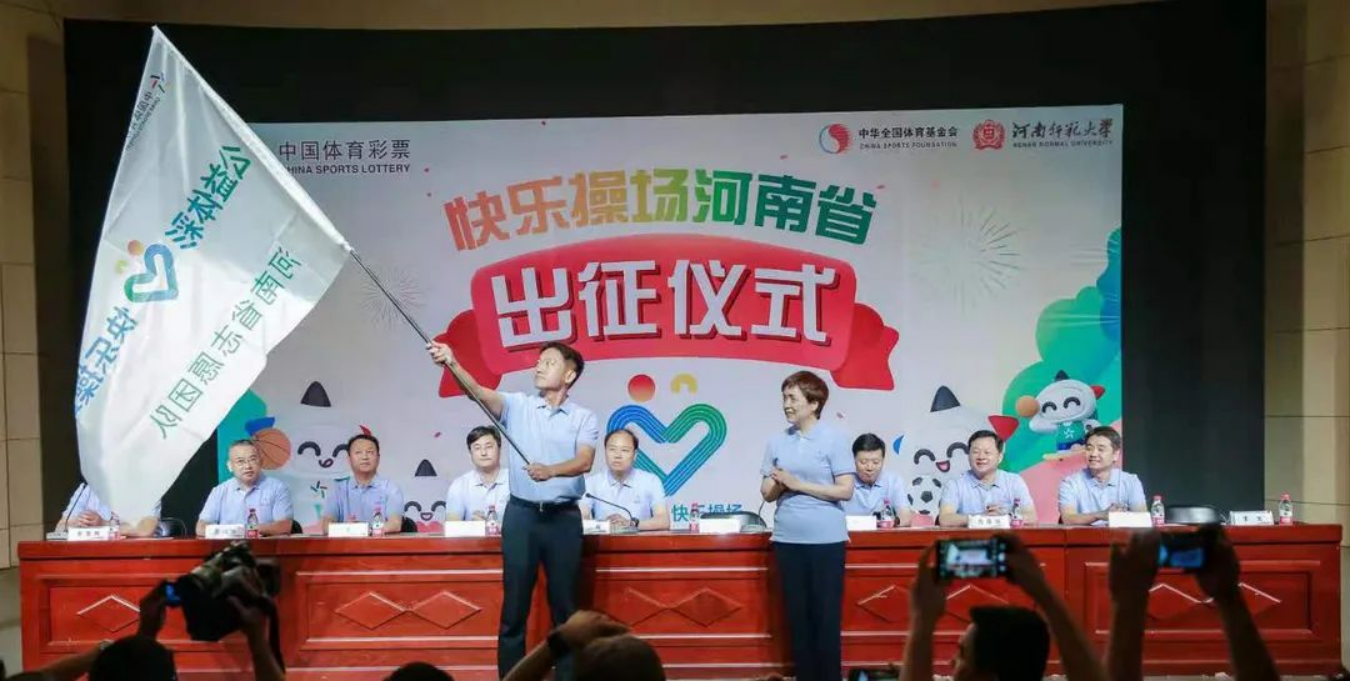 出征仪式上,新乡市体育局党组书记、局长许毅明向河南师范大学团委副书记杨上上颁发支教牌匾,河南省体育彩票管理中心主任王海新向河南师范大学体育学院党委书记王允教授进行出征授旗,与会嘉宾向20名参与支教的大学生颁发了志愿者证书。