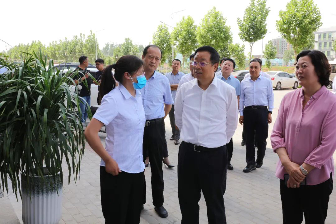 2021年5月28日,窦荣兴董事长(中)、苏州银行董事长王兰凤(右)等一行到新郑市新店镇茨山社区普惠金融服务站调研。李文波 摄影