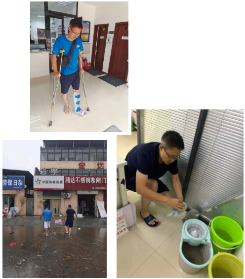 带领分中心工作人员自救、转移分中心物资、为被困群众提供避难场所、走访慰问受灾体彩实体店、在捐赠物资转运点搬运物资、到卫河边装沙袋、搬运沙袋,从持续降雨以来,新乡体彩分中心副主任王磊一刻都没有停,但是有谁知道,他是忍受着骨折的疼痛,在做这些事情。至今,他还拄着拐,坚守在工作岗位上。