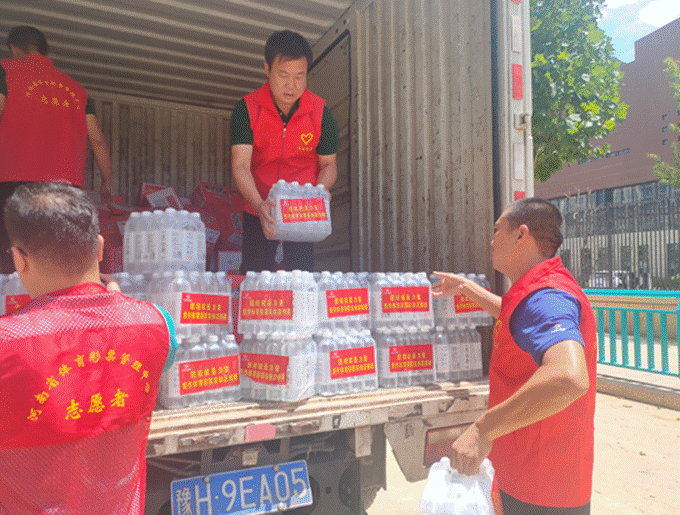 7月29日早上10:00,第一批价值11778.4元物资,包括方便面100箱共计1200桶,瓶装水236件共计2832瓶 ,火腿肠60箱共计2160根筹备到位,从焦作体彩分中心出发赶往白沙镇。