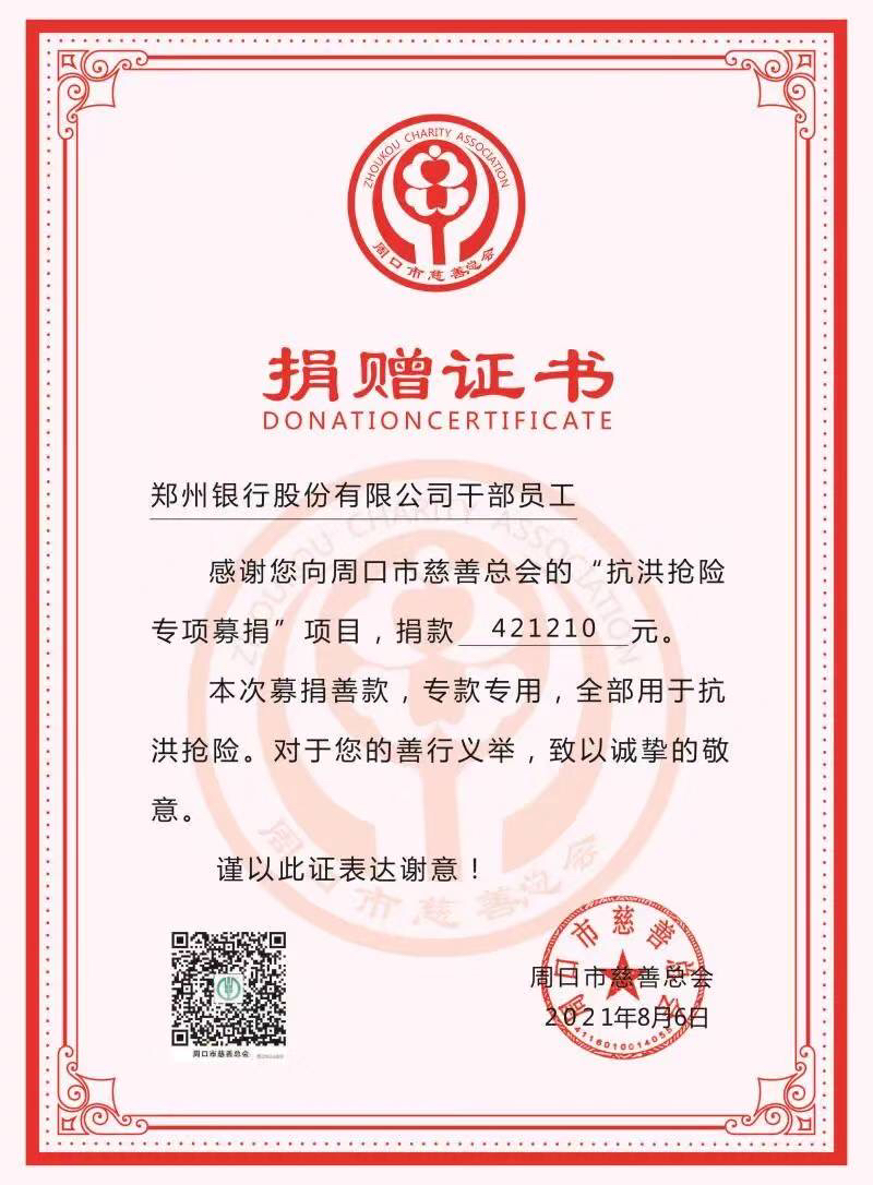 “郑周”同袍,共建家园。7月28日至30日,郑州银行在总行大楼组织开展支援扶沟西华灾后重建的无记名捐款活动,行领导、驻行纪检监察组、商都公司、各分支行、总行部室及河南九鼎金融租赁公司、村镇银行等附属机构职工踊跃参与,两天时间内共捐款421210元(含此前公布的392710元及又有支行后续捐助的28500元)。