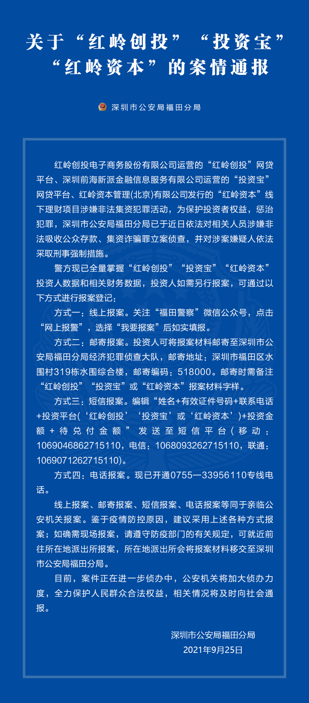 深圳市公安局福田分局表示,警方现已全量掌握“红岭创投”“投资宝”“红岭资本”投资人数据和相关财务数据,投资人如需另行报案,可通过线上报案、邮寄报案、短信报案、电话报案等方式进行报案登记。