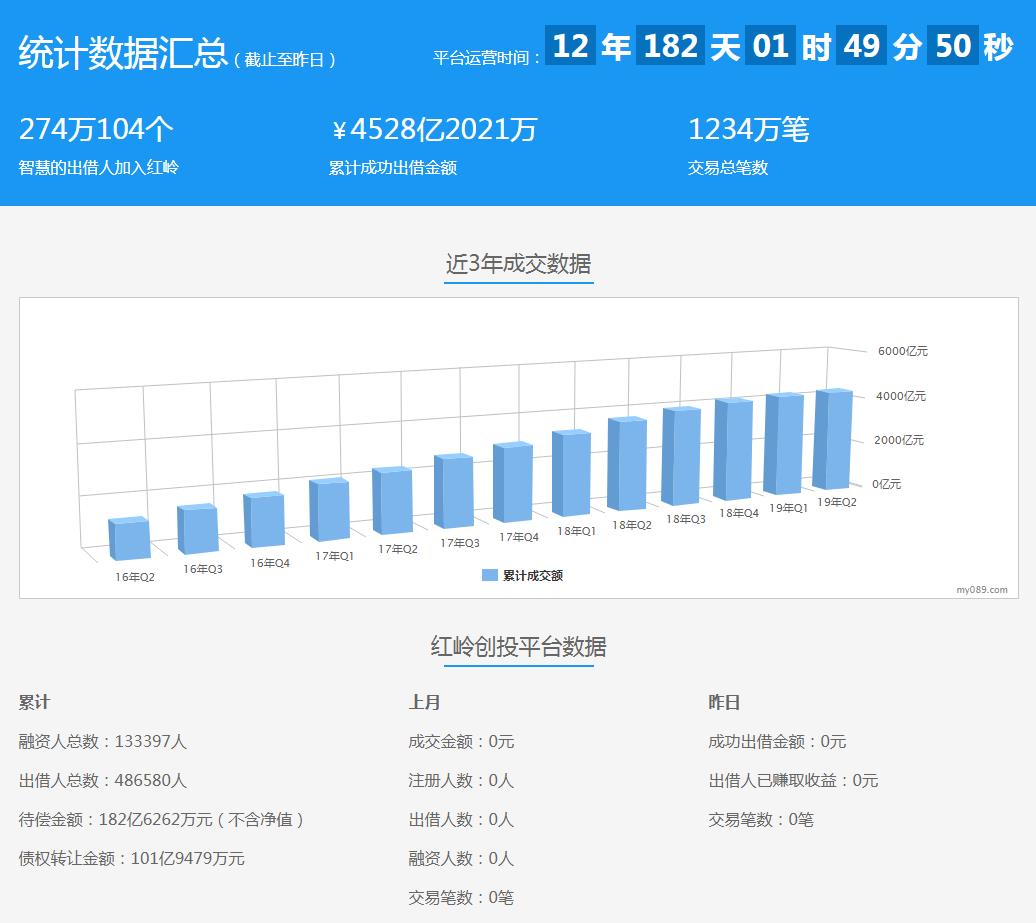 官网数据显示,在上线经营12余年时间里,红岭创投平台累计出借人超过274万,累计出借金额超过4500亿元,累计交易笔数高达1234万笔,目前待偿金额达182.63亿元(不含净值)。