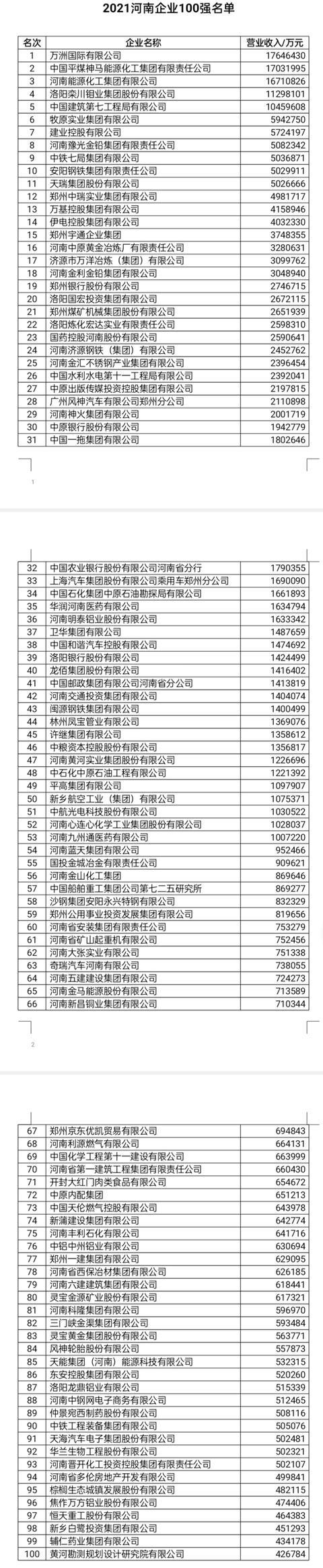 大河网讯 12月22日,河南省企业联合会发布消息,公布“2021河南企业100强”榜单。双汇以1764.64千亿的营收位居第一名,平煤神马、河南能源紧随其后。共有5家企业突破千亿级营收。