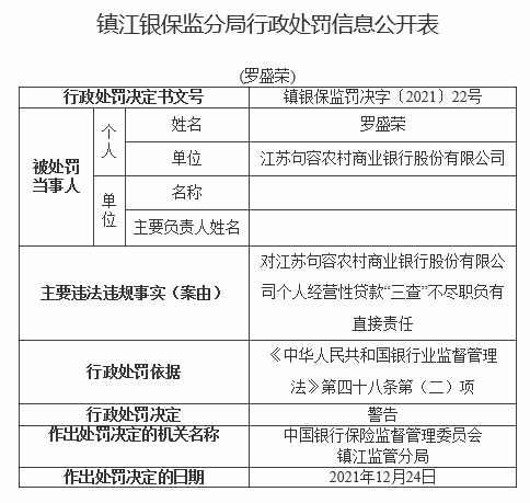 镇江银保监分局行政处罚信息公开表(镇银保监罚决字〔2021〕22号)显示,罗盛荣对江苏句容农村商业银行股份有限公司个人经营性贷款“三查”不尽职负有直接责任,依据《中华人民共和国银行业监督管理法》第四十八条第(二)项,镇江银保监分局对其予以警告。