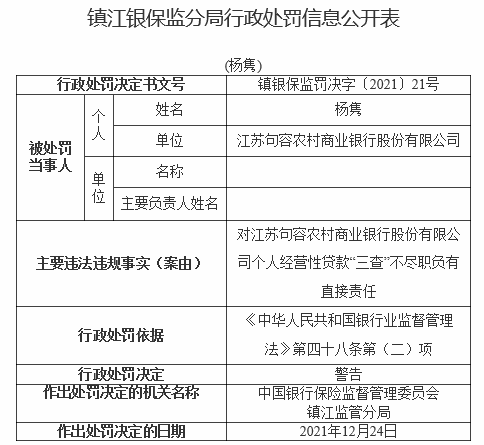 同时披露的镇江银保监分局行政处罚信息公开表(镇银保监罚决字〔2021〕21号)显示,杨隽对江苏句容农村商业银行股份有限公司个人经营性贷款“三查”不尽职负有直接责任,依据《中华人民共和国银行业监督管理法》第四十八条第(二)项,镇江银保监分局对其予以警告。