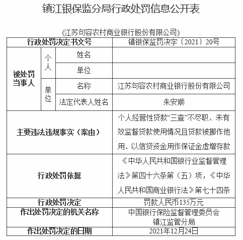 信息公开表显示,江苏句容农村商业银行股份有限公司存在个人经营性贷款“三查”不尽职、未有效监督贷款使用情况且贷款被挪作他用、以信贷资金用作保证金虚增存款的主要违法违规事实。镇江银保监分局依据《中华人民共和国银行业监督管理法》第四十六条第(五)项,《中华人民共和国商业银行法》第七十四条,对其罚款人民币135万元。