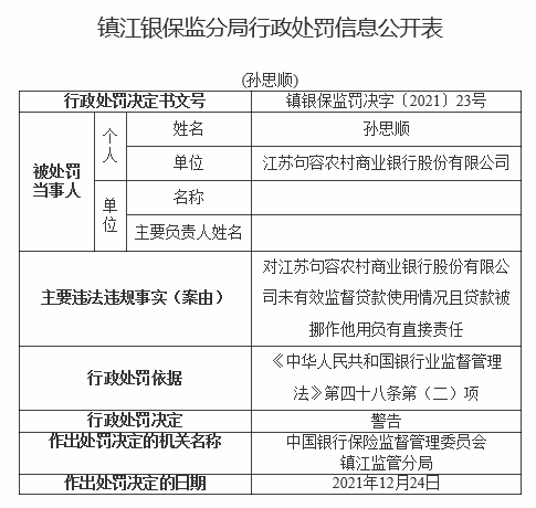 镇江银保监分局行政处罚信息公开表(镇银保监罚决字〔2021〕23号)显示,孙思顺对江苏句容农村商业银行股份有限公司未有效监督贷款使用情况且贷款被挪作他用负有直接责任,依据《中华人民共和国银行业监督管理法》第四十八条第(二)项,镇江银保监分局对其予以警告。