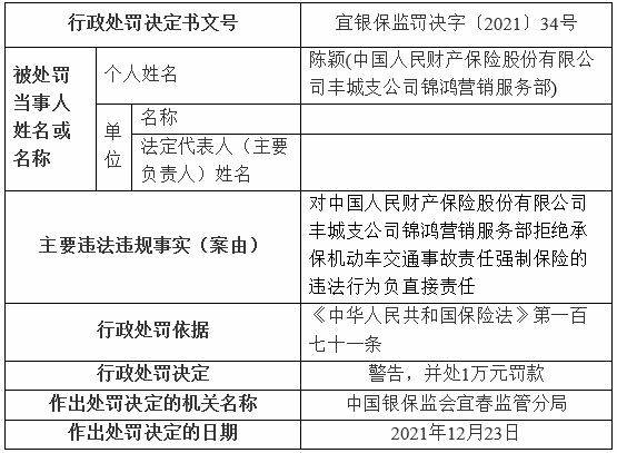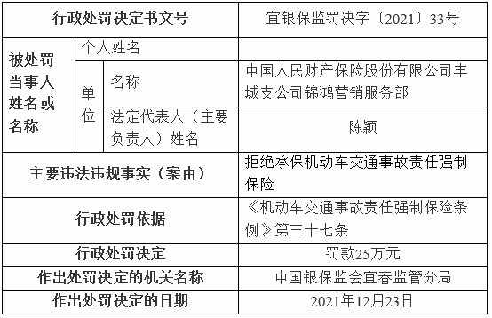 中国经济网北京1月4日讯 银保监会网站近日披露的宜春监管分局行政处罚信息公开表(宜银保监罚决字〔2021〕33号、34号、35号)显示,中国人民财产保险股份有限公司丰城支公司锦鸿营销服务部拒绝承保机动车交通事故责任强制保险。