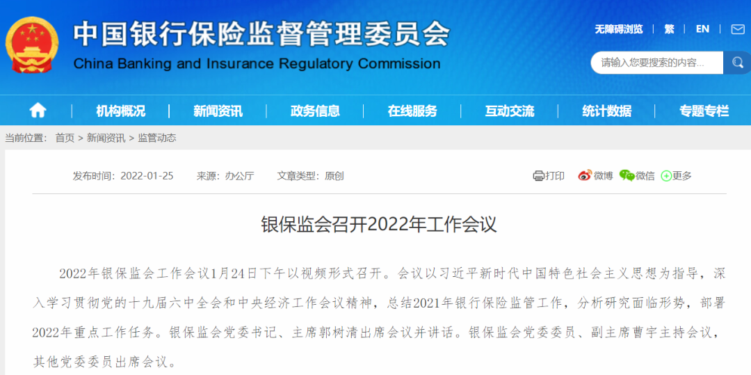 银保监会网站1月25日消息,2022年银保监会工作会议1月24日下午以视频形式召开,总结2021年银行保险监管工作,分析研究面临形势,部署2022年重点工作任务。