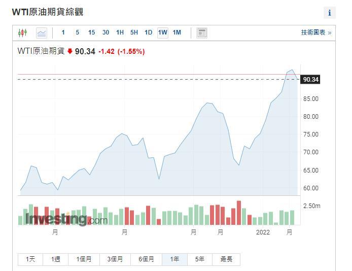 WTI原油期货价格一年来持续走高。数据来自英为财情。