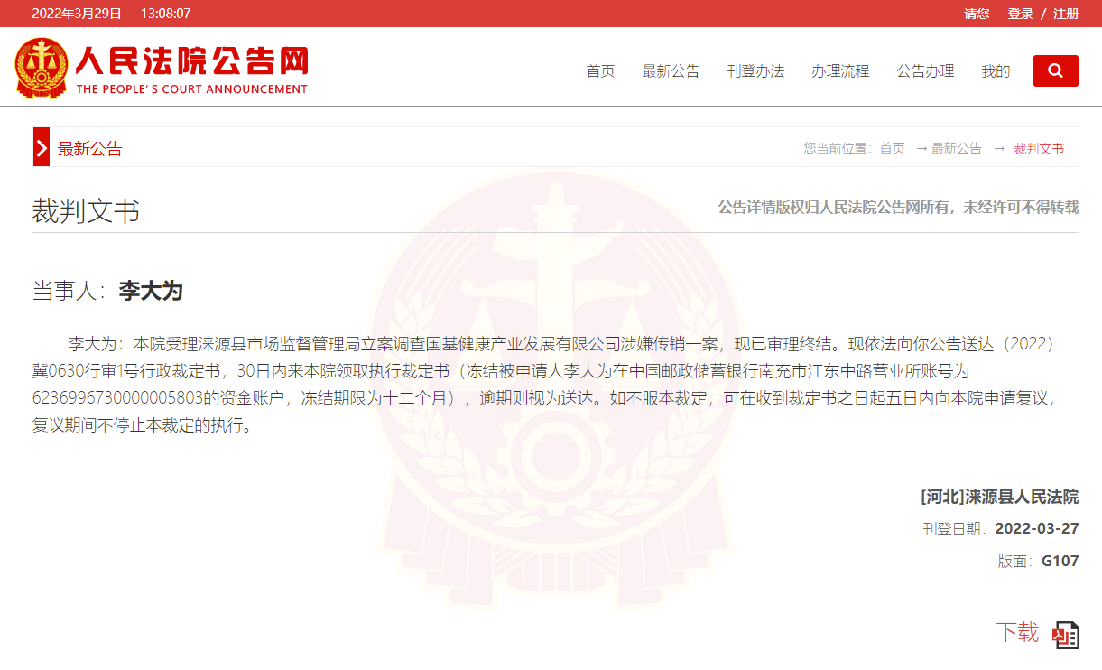 日前,人民法院公告网上公布了一则裁判信息,国基健康产业发展有限公司(简称:国基健康)因涉嫌传销,相关人员的资金账户被涞源县法院裁定冻结。具体信息如下: