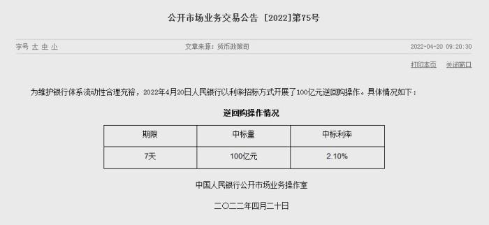 中新财经4月20日电 据央行官网消息,为维护银行体系流动性合理充裕,2022年4月20日人民银行以利率招标方式开展了100亿元逆回购操作。期限为7天,中标利率为2.10%,与此前持平。(完)