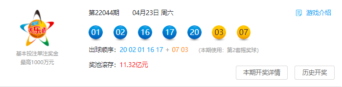 4月23日晚,超级大乐透第22044期开奖,也是超级大乐透10亿大派奖第5期开奖,本期前区开出号码“01、02、16、17、20”,后区开出号码“03、07”。本期全国销量为3.51亿元,为国家筹集彩票公益金1.26亿元。全国中出4注一等奖,其中山东省临沂市一幸运儿独揽一等奖1500万派奖奖金,擒获一注32,999,999元一等奖。